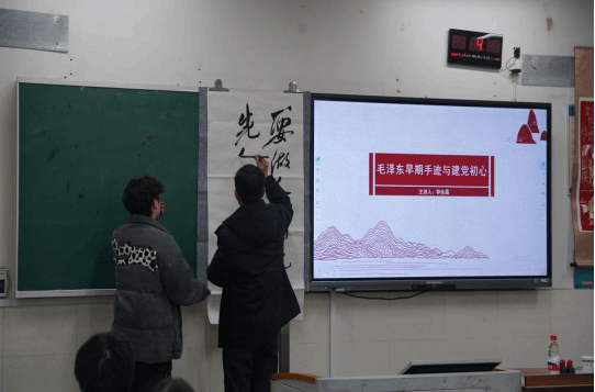 随后,书法专业教师钟全昌博士以“毛泽东书法艺术研究”为主题,为同学们带来一堂生动深刻的红色美育课程。钟老师结合毛泽东同志的革命历程与书法作品,从笔墨气韵、精神内涵、时代价值等方面深入解读,带领同学们在一幅幅作品、一段段文字中感悟革命先辈的理想信念与家国情怀,让红色基因、革命薪火在笔墨间传承。课程兼具艺术感染力与思想引领力,使同学们接受了一次深刻的红色教育与精神洗礼。
