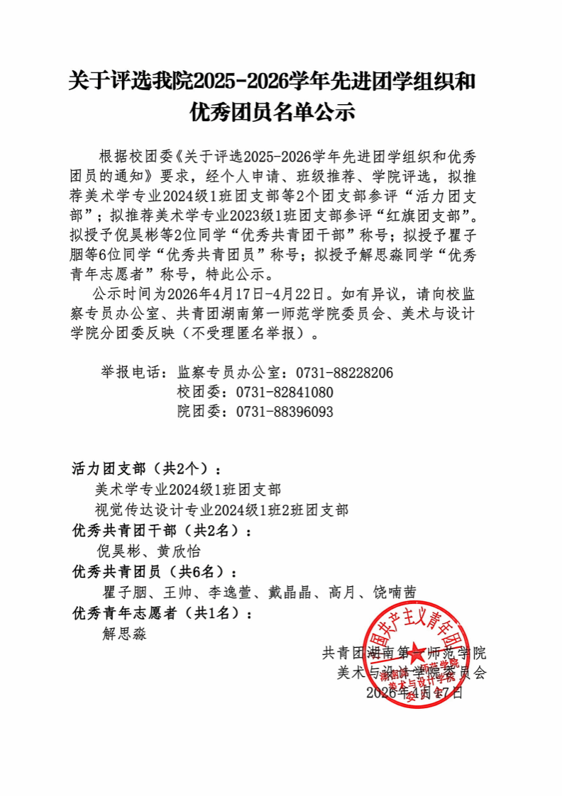 公示时间为2026年4月17日-4月22日。如有异议,请向校监察专员办公室、共青团湖南第一师范学院委员会、美术与设计学院分团委反映(不受理匿名举报)。